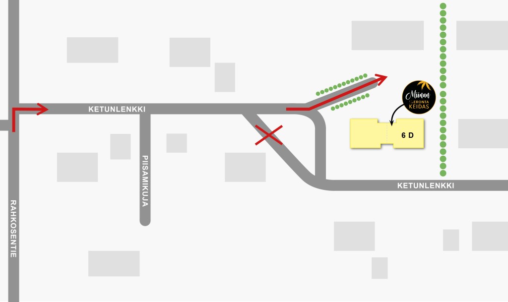 Kun saavut (Ketunlenkki 6 D) voit jättää autosi merkityille P-paikoille. Jos sisällä on edellinen asiakas, hänen autonsa voi olla myös pihassa. Odota pihassa omaa vuoroasi. Kutsun sinut sisälle muutama minutti ennen aikaasi. Huomioithan, että et jätä autoasi naapureiden alueelle! Sallittu alue merkitty katkoviivalla.